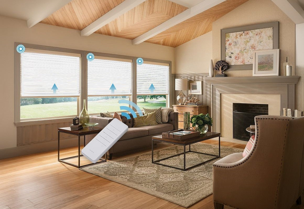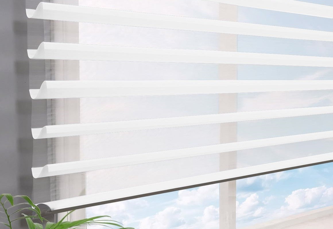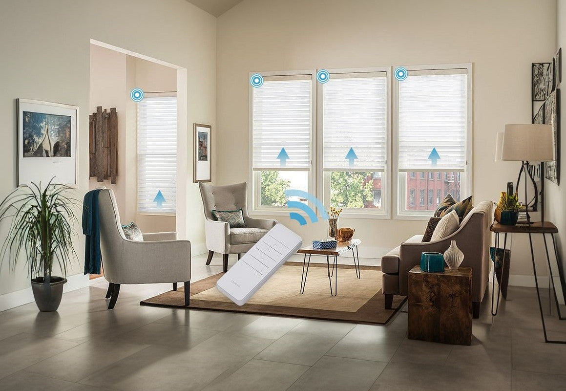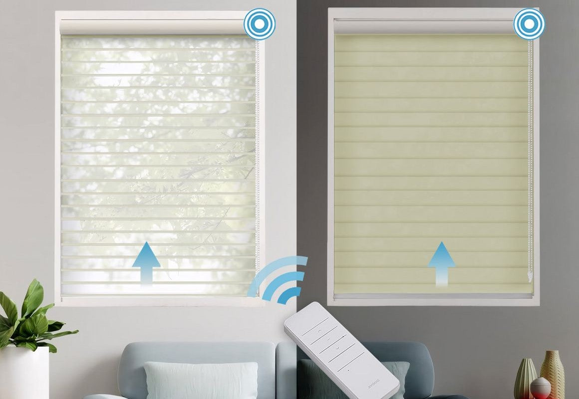 Transform your space with the soft elegance of Motorized Light Filtering Shangri-La Blinds. These innovative blinds feature horizontal fabric vanes suspended between two sheer layers, allowing natural light to gently diffuse while preserving privacy. Effortlessly control light and ambiance with the touch of a button—perfect for living rooms, offices, and more.