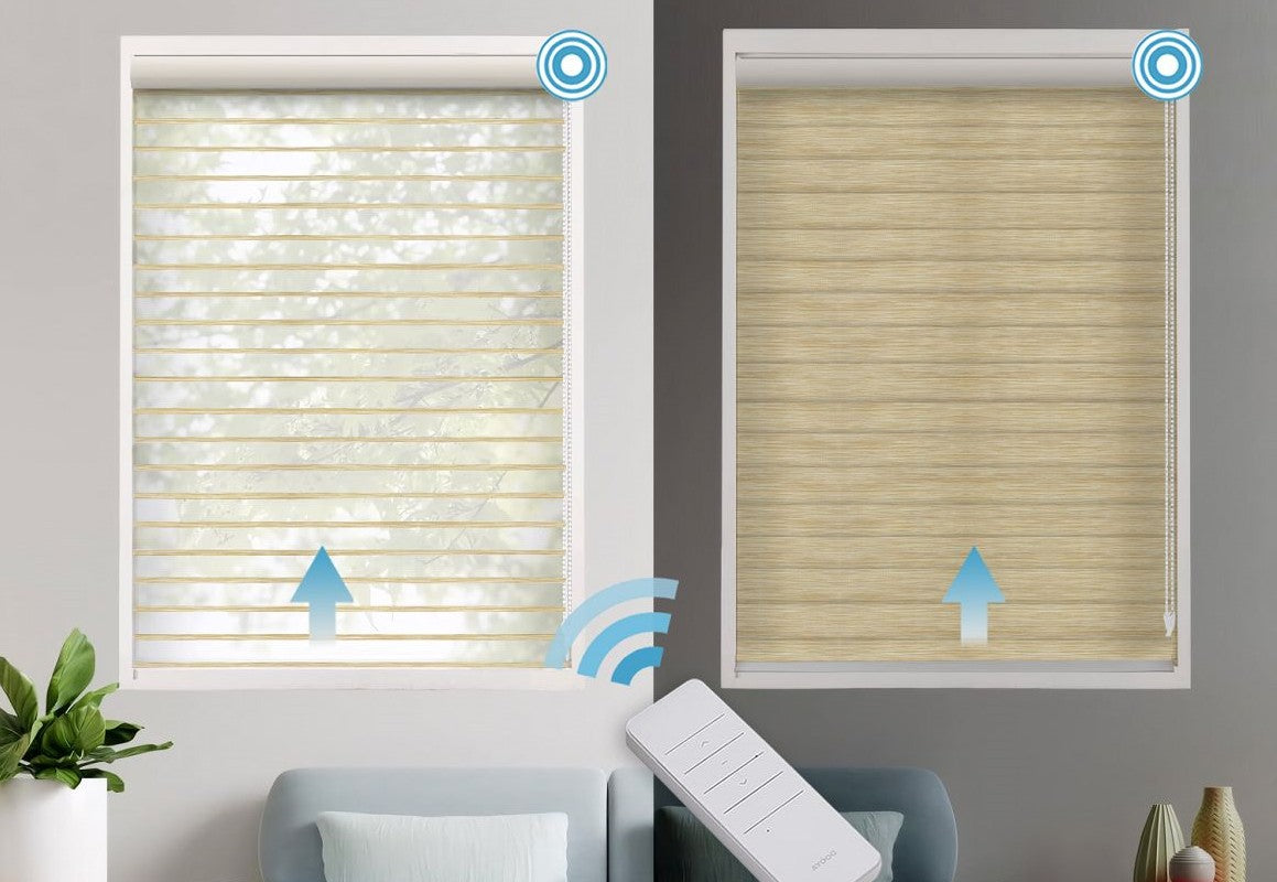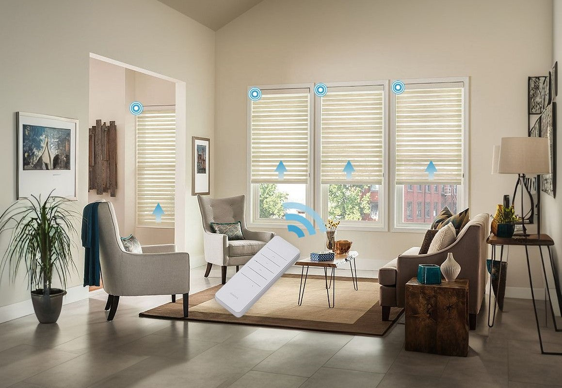 Elevate your interior with the refined glow of Motorized Mica Light Filtering Shangri-La Blinds. Featuring elegant horizontal vanes delicately suspended between sheer fabric layers, these blinds filter light with a warm mica tone while preserving your view and privacy. The motorized design offers seamless operation at your fingertips, combining style with smart convenience.